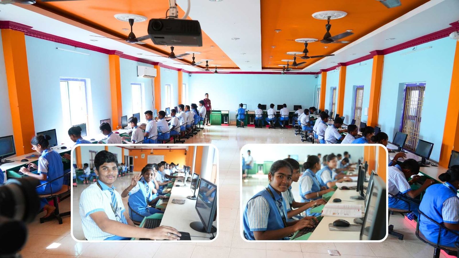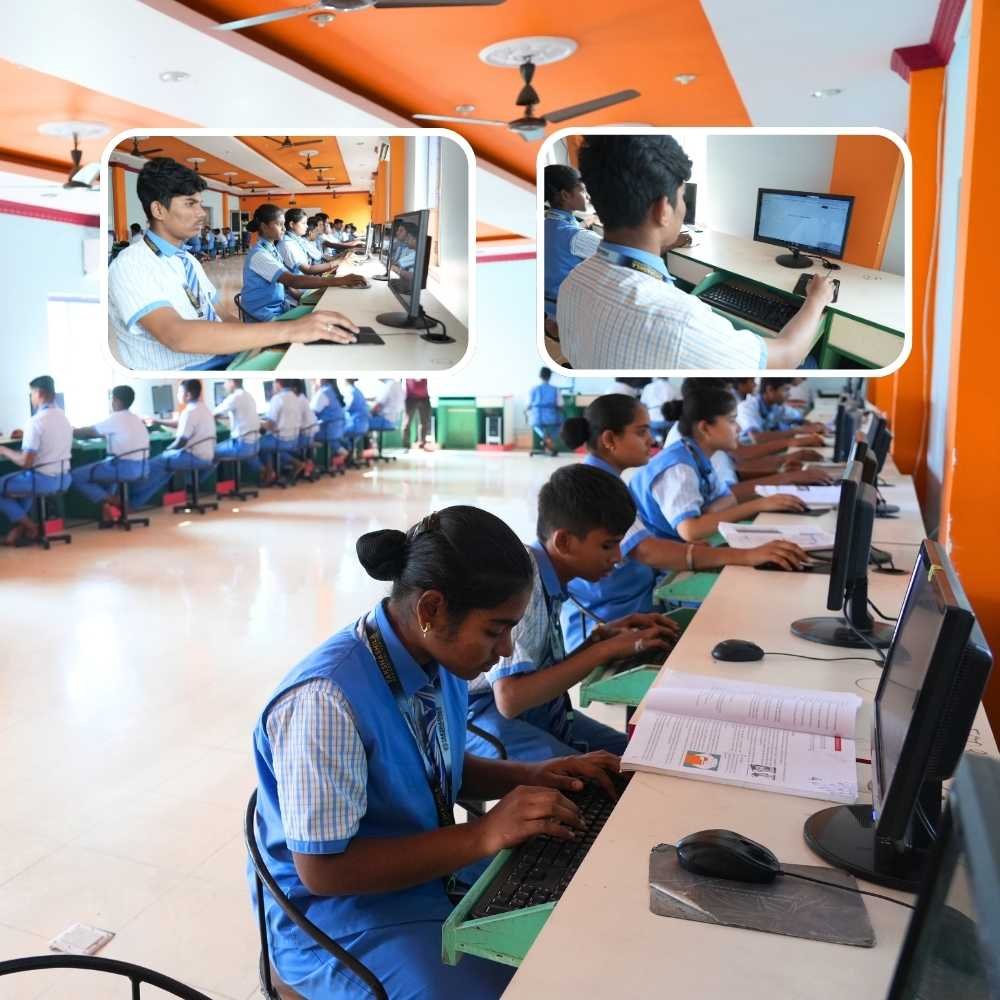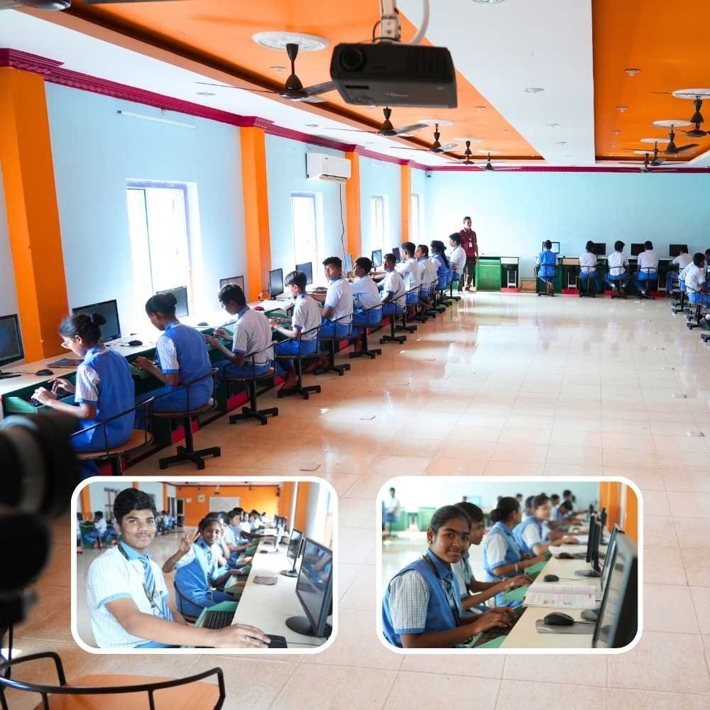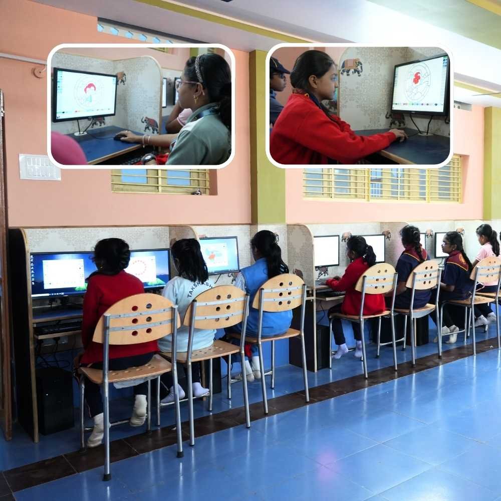 The computer lab introduces students to fundamental digital skills like typing, browsing, coding basics, and use of educational software.